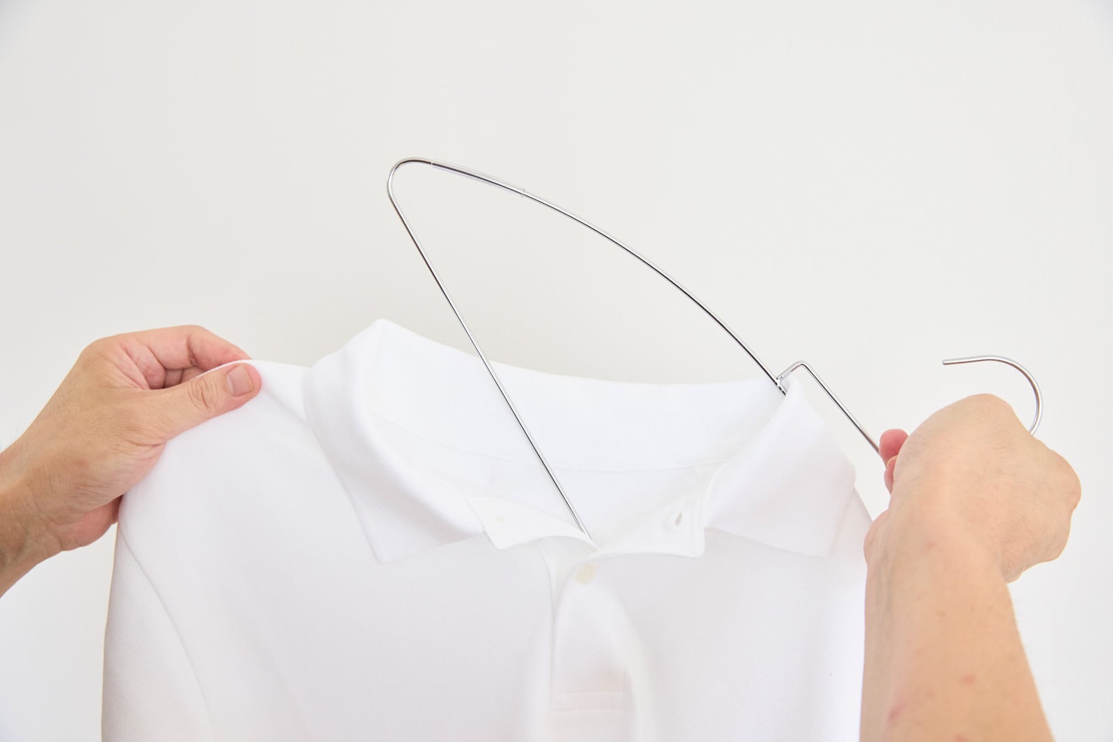 Tシャツハンガーは洗濯物を左手にハンガーを右手に持ち、首もとから切り込み部分まで入れてから反対側を首もとに入れれば簡単にハンガー干しができる便利グッズ。